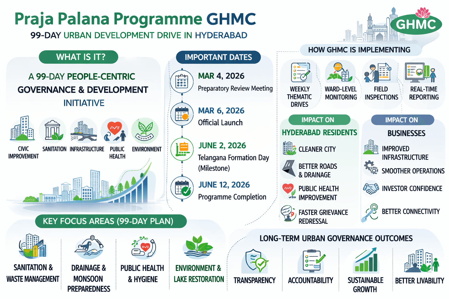 The Praja Palana Programme GHMC is a structured 99-day governance initiative launched within the limits of the Greater Hyderabad Municipal Corporation to accelerate urban development, improve sanitation, and strengthen civic infrastructure across Hyderabad.