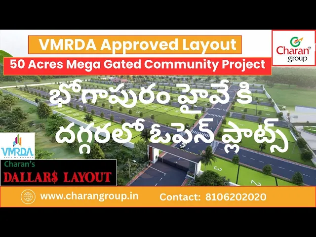 Located near the upcoming Bhogapuram Greenfield International Airport, Charan’s Dallars Layout offers excellent connectivity to National Highway 16, Vizag city, and other major hubs. As part of the fast-growing Bhogapuram real estate ventures, this project features strategically located in Bhogapuram with strong ROI potential. With plot prices ranging from ₹30 Lakhs to ₹3 Crores, it is an ideal choice for buyers seeking gated community plots near Bhogapuram, surrounded by major residential and commercial developments. Whether you’re looking for Bhogapuram land for sale or planning to build your dream home near Bhogapuram International Airport, Charan’s Dallars Layout offers a secure, future-ready investment in one of Andhra Pradesh’s fastest-developing corridors.